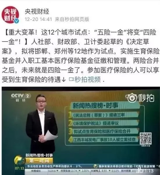 01、重磅!五險將變為四險 早在2016年,國務院就對重慶、內江、昆明、岳陽、鄭州、威海、合肥、泰州、沈陽、邯鄲、晉中這12個城市進行試點,實施生育保險并入醫療保險基金征繳和管理,試點時間為:2年。