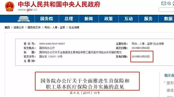 2019年3月月15日,國務院正式發布《關于全面推進生育保險和職工基本醫療保險合并實施的意見》(國辦發〔2019〕10號),意見指出,2019年底前實現兩項保險合并實施。