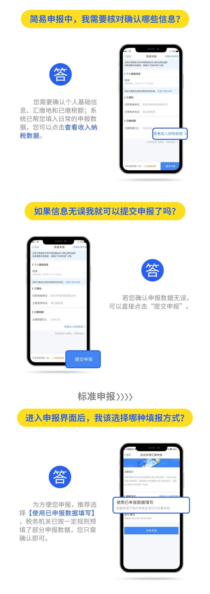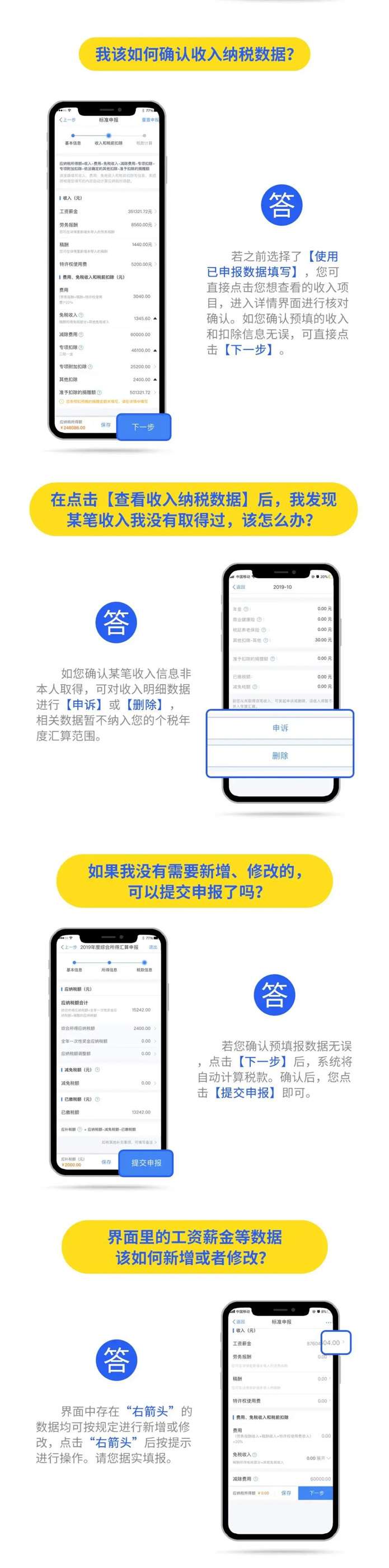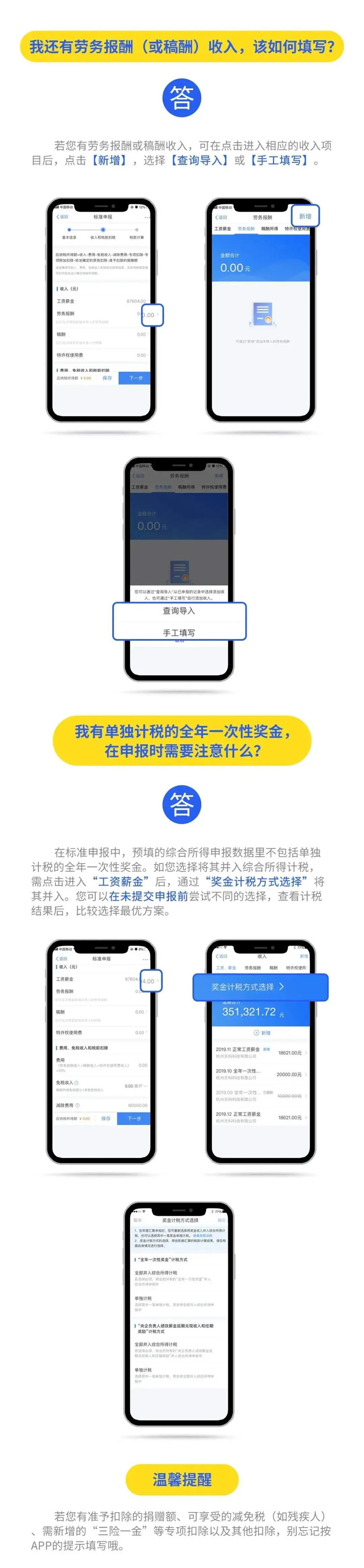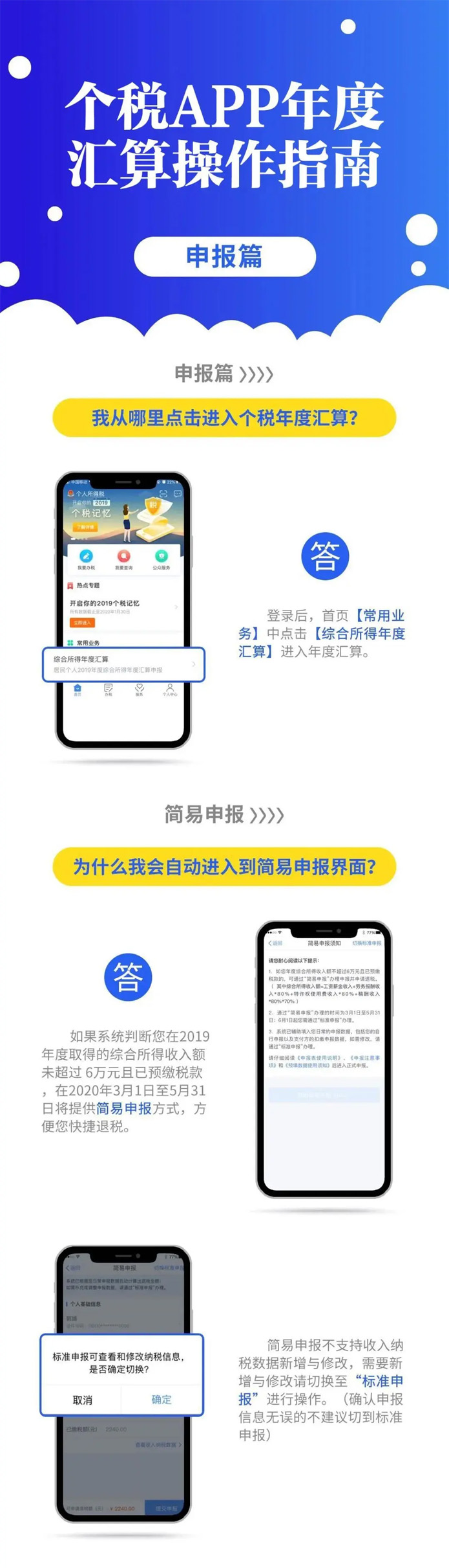 2019年度匯算應退或應補稅額=[(綜合所得收入額-60000元-“三險一金”等專項扣除-子女教育等專項附加扣除-依法確定的其他扣除-捐贈)×適用稅率-速算扣除數]-2019年已預繳稅額個人所得稅稅率表。 以下8種情況可退稅 有小伙伴說公式太復雜看不懂,自己也算不出來自己能是不是能退稅,能退多少稅。 沒關系,你只要記住,只要因為平時扣除不足或未申報扣除等原因導致多預繳了稅款,無論收入高低,無論退稅額多少,都可以申請退稅。 實踐中,一般有7種情況可能產生退稅: 1、2019年度綜合所得年收入額不足6萬元,但平時預繳過個人所得稅的。 舉個例子: 小明1月領取工資1萬元、個人繳付“三險一金”2000元,假設沒有專項附加扣除,預繳個稅90元;其他月份每月工資4000元,無須預繳個稅。全年看,因納稅人年收入額不足6萬元無須繳稅,因此預繳的90元稅款可以申請退還。 2、2019年度有符合享受條件的專項附加扣除,但預繳稅款時沒有申報扣除的。 舉個例子: 小王每月工資1萬元、個人繳付“三險一金”2000元,有兩個上小學的孩子,按規定可以每月享受2000元(全年24000元)的子女教育專項附加扣除。但因其在預繳環節未填報,使得計算個稅時未減除子女教育專項附加扣除,全年預繳個稅1080元。其在年度匯算時填報了相關信息后可補充扣除24000元,扣除后全年應納個稅360元,按規定其可以申請退稅720元。 3、因年中就業、退職或者部分月份沒有收入等原因,減除費用6萬元、“三險一金”等專項扣除、子女教育等專項附加扣除、企業(職業)年金以及商業健康保險、稅收遞延型養老保險等扣除不充分的。 舉個例子:老李于2019年8月底退休,退休前每月工資1萬元、個人繳付“三險一金”2000元,退休后領取基本養老金。 假設沒有專項附加扣除,1-8月預繳個稅720元;后4個月基本養老金按規定免征個稅。全年看,該納稅人僅扣除了4萬元減除費用(8×5000元/月),未充分扣除6萬元減除費用。年度匯算足額扣除后,該納稅人可申請退稅600元。 4、沒有任職受雇單位,僅取得勞務報酬、稿酬、特許權使用費所得,需要通過年度匯算辦理各種稅前扣除的。 5、納稅人取得勞務報酬、稿酬、特許權使用費所得,年度中間適用的預扣率高于全年綜合所得年適用稅率的。 舉個例子: 小趙每月固定一處取得勞務報酬1萬元,適用20%預扣率后預繳個稅1600元,全年19200元;全年算賬,全年勞務報酬12萬元,減除6萬元費用(不考慮其他扣除)后,適用3%的綜合所得稅率,全年應納稅款1080元。因此,可申請18120元退稅。 6、預繳稅款時,未申報享受或者未足額享受綜合所得稅收優惠的,如殘疾人減征個人所得稅優惠等。 7、有符合條件的公益慈善事業捐贈支出,但預繳稅款時未辦理扣除的。 8、年終獎稅率高于綜合所得稅率 且年終獎全額并入綜合所得后不會提高綜合所得稅率級數的,在個稅匯算清繳時年終獎全年一次性獎金計稅方式中選擇全部并入綜合所得,也有可能會發現應繳納的稅金降低,從而獲得退稅。 當然,不是所有人都能退稅,還有人需要補稅。 綜合所得年收入超過12萬元且年度匯算補稅金額在400元以上的納稅人,才需要辦理年度匯算并補稅。 匯算清繳的操作不能省 還有的小伙伴來問,個稅問題太復雜,自己可不可以不去管它,小智很認真嚴肅地回答你:不可以!!! ■ 退稅可以放棄 國家稅務總局表示,如果你是屬于需要退稅的,是否辦理年度匯算申請退稅是你的權利,無需承擔任何責任。 ■ 補稅必須辦如果你是屬于應當補稅的,辦理年度匯算是你的義務 根據稅收征管法第六十二條,納稅人未按照規定期限辦理納稅申報和報送納稅資料的,由稅務機關責令限期改正,可以處2000元以下的罰款; 情節嚴重的,可以處2000元以上1萬元以下的罰款,并追繳稅款、加征滯納金。滯納金則從超過繳納期限之日起,按日加收滯納稅款萬分之五。 也就是說,年度匯算申報后,如果你需要補稅,請在2020年6月30日前補繳稅款,否則將面臨每日萬分之五加收滯納金。 附上個稅APP年度匯算操作指南