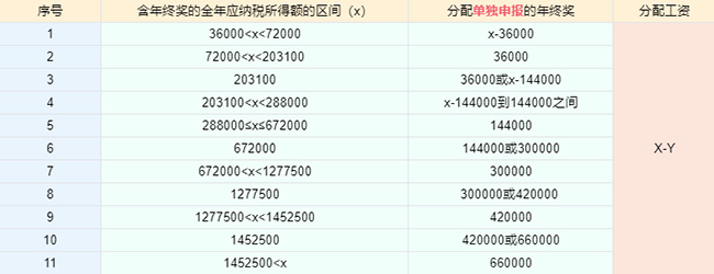 年終獎選擇兩種方式都可以。 (3)當年收入(含年終獎)減去6萬及三險一金、附加扣除等后應納稅所得額>36000 當含年終獎的全年應納稅所得額大于36000時,由于年終獎單獨申報存在雷區等原因,為使稅負最低,可在年終獎和工資之間進行分配,分配的年終獎按照全年一次性獎金單獨申報。