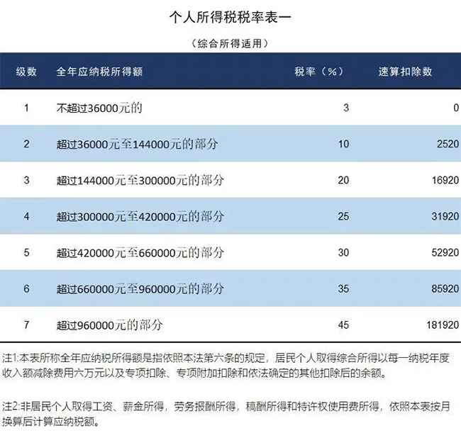 3、綜合所得稅率表(個稅匯算清繳時適用) 綜合所得是指居民個人取得的工資、薪金所得;勞務報酬所得;稿酬所得和特許權使用費所得,適用百分之三至百分之四十五的超額累進稅率(預扣率表見前述一、二)。