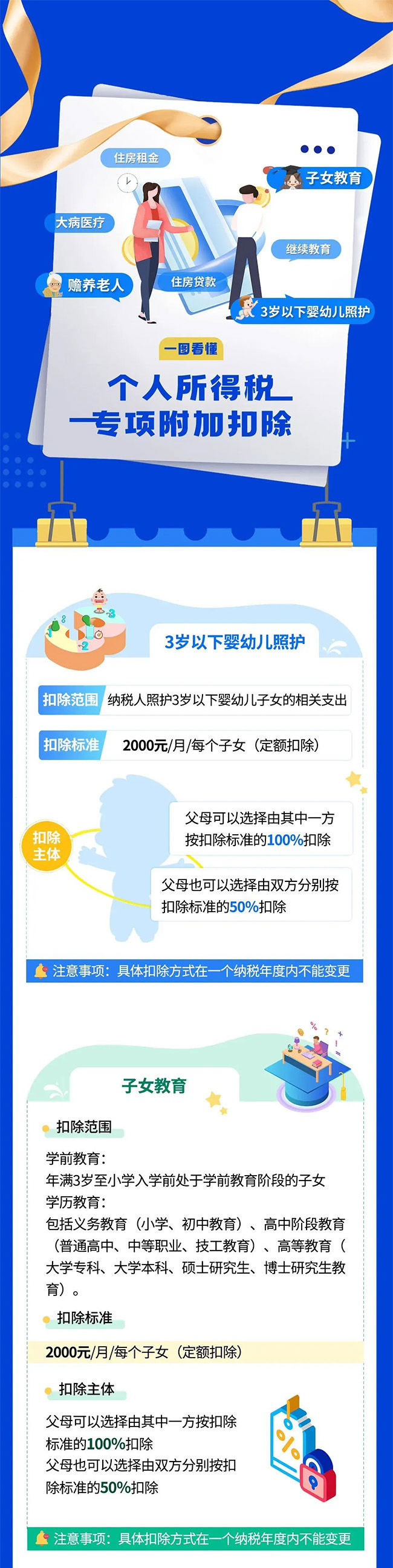 政策內容: 一、3歲以下嬰幼兒照護專項附加扣除標準,由每個嬰幼兒每月1000元提高到2000元。 二、子女教育專項附加扣除標準,由每個子女每月1000元提高到2000元。 三、贍養老人專項附加扣除標準,由每月2000元提高到3000元。其中,獨生子女按照每月3000元的標準定額扣除;非獨生子女與兄弟姐妹分攤每月3000元的扣除額度,每人分攤的額度不能超過每月1500元。 四、3歲以下嬰幼兒照護、子女教育、贍養老人專項附加扣除涉及的其他事項,按照《個人所得稅專項附加扣除暫行辦法》有關規定執行。 五、上述調整后的扣除標準自2023年1月1日起實施。 專項附加扣除每個月標準提高,意味著能夠享受上述扣除的納稅人,可以扣除更多的應納稅額,從而少交個稅,增加到手收入。 那么,調整后,每個人到底可以增加多少收入?這跟每個人的具體情況息息相關。 02、到底能增加多少收入? 由于目前一年個稅起征點(基本減除費用)為6萬元,再疊加7項專項附加扣除等各類扣除項目,實際起征點更高。 對于無需繳納個稅的人群,“一老一小”扣除標準提高與否,對他們并無影響。真正影響的是繳納個稅且有老人孩子的納稅人。 對于這些人而言,假如有兩個孩子,“一老一小”扣除標準每月提高1000元,最高能比之前多享受每月3000元個稅扣除額,一年則是36000元。如果該人適用最高的45%個稅邊際稅率,那么,理論上可享受1.62萬元個稅減稅額。當然,如果有更多的孩子,可以享受更高的扣除額度,到手收入會更高。 不過,贍養岳父母或公公婆婆是不能享受贍養老人專項附加扣除的。根據現行政策規定,贍養老人專項附加扣除政策中的老人(被贍養人),是指年滿60歲的父母,以及子女均已去世的年滿60歲的祖父母、外祖父母,不包括配偶的父母。 03、最全個人所得稅扣除項目