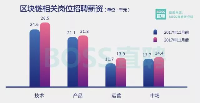 與海外相比,國內區塊鏈人才供應增長態勢較為穩定。2018年前兩個月,人才供應量同比增加235%,增速 雖高于其他互聯網職位,但存量仍遠低于實際需求。 截至2018年2月,專業區塊鏈技術人才的供需比僅為0.15,嚴重不足(人工智能相關人才的供需比為0.62。 人才供需比低于1說明人才供不應求,數值越低表明缺口越高)。 2017年11月之前,區塊鏈相關崗位的平均招聘薪資為2.32萬元。2017年11月之后,區塊鏈相關崗位的平均 招聘薪資達到2.58萬元。 2、區塊鏈相關崗位類型和地域分布 區塊鏈成為風口之后,圈內不可避免地出現一些掛羊頭賣狗肉的蹭風口型崗位,只是加上區塊鏈三個字, 薪資便能提升一截。 然而BOSS直聘研究院通過技能與職位相關性分析發現,目前市面上的擦邊球崗位并不多, 90%的職位為專業區塊鏈相關崗位。 從職位分布上看,有73.7%的區塊鏈相關崗位為技術類,7.5%為產品類、 8.4%為運營類,還有10%其他崗位(包括行業分析師、市場推廣、記者等)。
