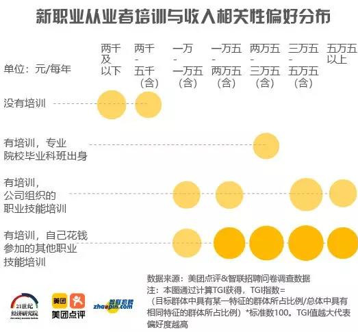 7、參加優質且針對性強的職業培訓,是提升新職業從業者收入的重要渠道。TGI指數顯示,培訓投入與獲得的收入直接相關。若新職業從業者沒有參加過培訓,月薪在2000元以下及2000-5000元(含)之間的分布更多;若參加過公司組織的職業技能培訓,月薪在10000元以上的分布更高;若新職業從業者自費參加其他的職業技能培訓,月薪在15000元以上的分布更高,且獲得更高薪酬的可能性進一步加大。