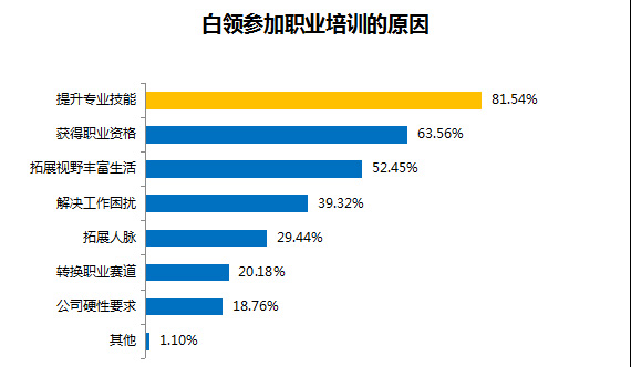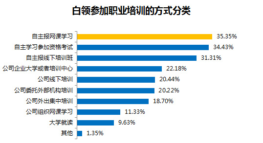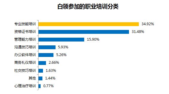 不過(guò),在一些企業(yè)中也有要求白領(lǐng)參加職業(yè)培訓(xùn)的,表現(xiàn)最為突出的是機(jī)關(guān)事業(yè)單位,達(dá)25.55%,私營(yíng)企業(yè)要求員工參加職業(yè)培訓(xùn)所占比重最少,僅17.16%。 調(diào)查顯示,白領(lǐng)參加過(guò)專業(yè)技能培訓(xùn)占比最多,達(dá)到34.92%,其次是資格證書(shū)培訓(xùn)占比31.48%,這與從業(yè)的崗位息息相關(guān),譬如財(cái)務(wù)、人力資源等;在練就硬實(shí)力的同時(shí)越來(lái)越多的人注重軟實(shí)力的培養(yǎng),管理能力培訓(xùn)就以15.9%的占比成為了職業(yè)培訓(xùn)中的參與率第三。