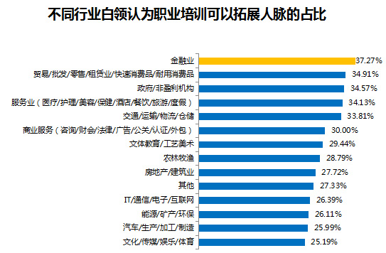 調(diào)查發(fā)現(xiàn),部分行業(yè)對(duì)于拓展人脈也比較看重,金融業(yè)認(rèn)為職業(yè)培訓(xùn)可以拓展人脈的占比達(dá)37.27%,居行業(yè)首位;貿(mào)易、服務(wù)業(yè)等這類普遍需要人際關(guān)系助力的行業(yè)中,也有超過(guò)三成的職場(chǎng)人參加培訓(xùn)的初衷是為了拓展人脈。