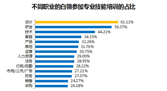 設(shè)計(jì)/研發(fā)崗位更注重專業(yè)技能的提升,財(cái)務(wù)/人力資源等崗位更需要資格證書(shū) 不同行業(yè)、薪資、年齡層及性質(zhì)的企業(yè)對(duì)職業(yè)培訓(xùn)的選擇也有所差異。從職業(yè)來(lái)看,設(shè)計(jì)、研發(fā)等職位更為注重專業(yè)技能的培訓(xùn),在他們參加過(guò)的職業(yè)培訓(xùn)中,專業(yè)技能培訓(xùn)均在56%以上,遠(yuǎn)超于其他行業(yè)。