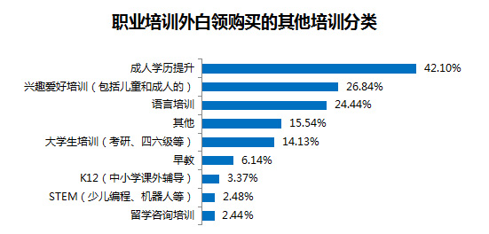 財(cái)務(wù)崗位的職場(chǎng)人最重視資格證書(shū),選擇參加資格證書(shū)的培訓(xùn)遠(yuǎn)超其他崗位,達(dá)到58.51%,人力資源和法務(wù)崗位參與過(guò)資格證書(shū)培訓(xùn)的人大約在40%左右。 白領(lǐng)管理能力培訓(xùn)持續(xù)火熱,薪資愈高愈受追捧,70后參與度最高 從薪資來(lái)看,月薪10,000元以上的白領(lǐng)參加管理能力培訓(xùn)的比例均超過(guò)了24%,其中15,001-20,000元區(qū)間的占比最高,達(dá)到31.67%,總體來(lái)說(shuō)薪資水平越高對(duì)管理能力培訓(xùn)需求越高。 從年齡來(lái)看,注重自身管理能力培訓(xùn)的人群中,70后白領(lǐng)參與度最高,占比29.47%,其次是60后占比27.37%,而作為職場(chǎng)主力軍的80、90后則需要更多的職場(chǎng)磨練,核心硬實(shí)力的提升仍是首要目標(biāo)。 從企業(yè)性質(zhì)來(lái)看,外資及合資企業(yè)員工重視管理能力培訓(xùn)的人群,分別占比21.79%和19.71%,這與自由開(kāi)放的企業(yè)文化密不可分,國(guó)外文化的引入讓白領(lǐng)跟注重軟實(shí)力的提升,國(guó)內(nèi)企業(yè)中,民營(yíng)企業(yè)以15.93%的占比排在第三位。 除職業(yè)培訓(xùn)外,工齡越長(zhǎng)越重視成人學(xué)歷培訓(xùn),興趣愛(ài)好培訓(xùn)更受年輕人喜愛(ài) 在職業(yè)培訓(xùn)之外,白領(lǐng)還會(huì)購(gòu)買其他類型的教育培訓(xùn),成人學(xué)歷提升服務(wù)成為眾多職場(chǎng)人首選,有42.1%的人購(gòu)買過(guò)該類培訓(xùn)課程,工齡越長(zhǎng)的白領(lǐng)越重視成人學(xué)歷提升,北上廣深一線大城市尤為突出。興趣愛(ài)好培訓(xùn)是僅次于成人學(xué)歷提升人們更樂(lè)意購(gòu)買的教育培訓(xùn),達(dá)26.84%,體現(xiàn)了當(dāng)代職場(chǎng)人注重職業(yè)能力的同時(shí),也非常注重家庭與生活品質(zhì)的提升。