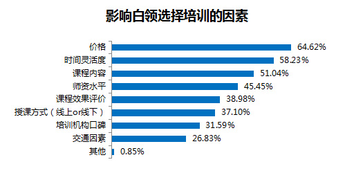 第二部分:評(píng)價(jià)與期望 近四成白領(lǐng)不滿意當(dāng)前職業(yè)培訓(xùn),認(rèn)為效果不理想且價(jià)格高,愈年輕滿意度愈低 越來(lái)越多白領(lǐng)選擇進(jìn)行職業(yè)培訓(xùn),職業(yè)培訓(xùn)的重要性不言而喻,職業(yè)培訓(xùn)滿意度成為不可低估的一項(xiàng)指標(biāo)。數(shù)據(jù)顯示,白領(lǐng)對(duì)自己參加的職業(yè)培訓(xùn)的整體滿意度為4.19,選擇滿意的占比73.82%,選擇不滿意的占比3.06%。 通過(guò)對(duì)職業(yè)培訓(xùn)不滿意的原因調(diào)查,“培訓(xùn)效果不理想”和“培訓(xùn)價(jià)格過(guò)高”是對(duì)課程不滿最為主要的原因,分別占比39.04%、38.64%,概括來(lái)說(shuō)主要是職業(yè)培訓(xùn)的性價(jià)比不高。培訓(xùn)機(jī)構(gòu)或企業(yè)在讓員工參與到職業(yè)培訓(xùn)的同時(shí)更應(yīng)該注重培訓(xùn)的質(zhì)量。 從年齡結(jié)構(gòu)來(lái)看,90后、95后對(duì)于課程的滿意度要低于70后和80后,95后對(duì)培訓(xùn)課程的滿意度僅為4.03。90后、95后進(jìn)入職場(chǎng)時(shí)間較短,需要熟悉和學(xué)習(xí)的地方有很多,一般的職業(yè)培訓(xùn)難以達(dá)到全方位立體化效果,同時(shí),此類新一代職場(chǎng)人在接受信息的方式上,與傳統(tǒng)培訓(xùn)的表達(dá)方式上有所差異,課程內(nèi)容多樣性與課程形式的生動(dòng)性,可能會(huì)對(duì)其產(chǎn)生不同的培訓(xùn)效果,這可能是他們對(duì)培訓(xùn)不滿的重要原因。 價(jià)格是白領(lǐng)選擇培訓(xùn)的主要考慮因素,女性白領(lǐng)對(duì)時(shí)間靈活度要求大于男性。 選擇進(jìn)行職業(yè)培訓(xùn),白領(lǐng)們有很多的因素需要考慮。數(shù)據(jù)顯示,64.62%的白領(lǐng)將價(jià)格作為選擇培訓(xùn)的首要因素,58.23%的白領(lǐng)將時(shí)間靈活度作為第二考慮因素。
