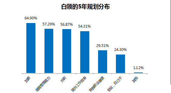 對(duì)比男女對(duì)時(shí)間靈活度的選擇,63.33%的女性白領(lǐng)認(rèn)為時(shí)間靈活度是主要考慮因素,較男性白領(lǐng)的占比多出10個(gè)百分點(diǎn),這或許與不同性別角色所存在的家庭因素聯(lián)系緊密。 對(duì)于未來(lái)5年職業(yè)發(fā)展規(guī)劃,超六成白領(lǐng)最渴望的是加薪,工作十年以上更渴求增強(qiáng)管理能力 個(gè)人所參與的職業(yè)培訓(xùn)與未來(lái)的職業(yè)發(fā)展規(guī)劃聯(lián)系緊密,數(shù)據(jù)顯示,白領(lǐng)對(duì)于自己的下一個(gè)5年規(guī)劃中64.9%的白領(lǐng)渴望加薪,57.29%的白領(lǐng)渴望增強(qiáng)管理能力,56.87%的白領(lǐng)渴望升職;女性白領(lǐng)的職業(yè)發(fā)展渴望要大于男性。工作年限與升職提升工作效率呈反比趨勢(shì),工作十年以上的白領(lǐng)對(duì)自己的管理能力的提升期望較大,這大多與自身所處職位密切相關(guān)。