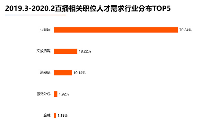 2019年3月-2020年2月,在直播類職位人才需求占比最高的前5個(gè)城市中,北京以26.52%的占比位居榜首。“千年商都”廣州與素有電商大本營(yíng)之稱的杭州并列第二,人才需求占比均為15.91%。上海以14.75%的占比緊隨其后。深圳則以7.96%的占比擠入前五。 北京作為創(chuàng)新創(chuàng)業(yè)的集聚地,是國(guó)內(nèi)眾多知名直播、短視頻類公司的所在地。如抖音、快手、映客、花椒直播等都將公司總部設(shè)在北京,因此北京對(duì)直播類人才需求最旺盛。而杭州作為我國(guó)電商行業(yè)的大本營(yíng),以及有阿里的坐鎮(zhèn),對(duì)直播帶貨類人才的需求一直以來(lái)都較為旺盛,超過(guò)半數(shù)淘寶機(jī)構(gòu)都在杭州,淘寶直播的產(chǎn)業(yè)鏈上下流催生了大量相關(guān)崗位需求。“千年商都”廣州自2019年起開(kāi)始化身“直播之城”,當(dāng)?shù)氐姆b、旅游、美食等越來(lái)越多行業(yè)從業(yè)者在直播間里找到源源不斷的消費(fèi)者。 2、行業(yè)人才需求分布:互聯(lián)網(wǎng)占據(jù)主導(dǎo)地位,直播類職位人才需求占比超70%