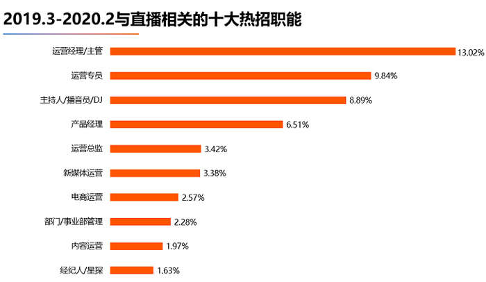 從各行業(yè)對(duì)直播類職位人才的需求分布來(lái)看,互聯(lián)網(wǎng)排名最高,遙遙領(lǐng)先其他行業(yè),占比為70.24%。文教傳媒、消費(fèi)品則分別以13.22%、10.14%的占比位居第二、第三。這三大行業(yè)對(duì)直播類人才的需求占比總和為93.60%。 直播是互聯(lián)網(wǎng)的衍生行業(yè)之一,與電商等互聯(lián)網(wǎng)行業(yè)有著極強(qiáng)的關(guān)聯(lián),因而互聯(lián)網(wǎng)對(duì)直播人才的需求最為旺盛;近年來(lái)隨著在線教育、線上營(yíng)銷行業(yè)的發(fā)展,文教傳媒行業(yè)對(duì)直播人才也有著較大的需求,尤其在當(dāng)前疫情下,更觸發(fā)了該行業(yè)對(duì)直播人才的需求。而消費(fèi)品行業(yè),由于天然符合“直播賣貨”屬性,同時(shí)當(dāng)前越來(lái)越多企業(yè)意識(shí)到直播在商品營(yíng)銷中的作用,因此對(duì)于直播人才也有不小的需求。 3、熱招職能:運(yùn)營(yíng)類直播相關(guān)職位人才需求最大,其次是主播類