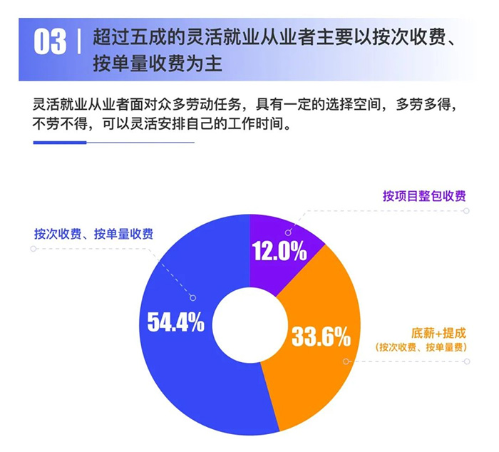 報告顯示,從生活服務業靈活就業從業者的月收入分布來看,16.8%的從業者月收入低于 3000元,40.4%的從業者月收入為3001-5000元,42.8%的從業者月收入高于 5000元。 根據國家統計局數據,2019年全國城鎮私營單位就業人員年平均工資為53604元。根據調查樣本進行推算,生活服務業靈活就業從業者的月平均收入為5061.6元,年收入為60732元。生活服務業靈活就業從業者收入略高于全國私營單位就業人員工資。這說明,勞動不分形態,只要努力工作,靈活就業從業者就有機會獲得較高的收入。 趨勢三:超過五成的靈活就業從業者主要以按次收費、按單量收費為主