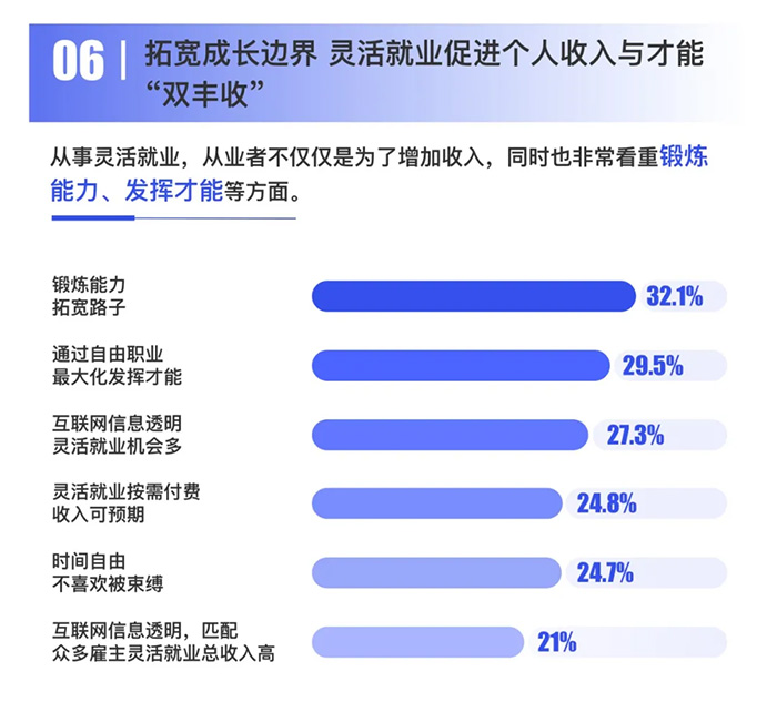 靈活就業從業者在渠道選擇方面上多樣化,傾向于等互聯網中介平臺 57.9%,老鄉、群友推薦占比40.6%,喔趣等新型靈活用工平臺占比25.2%。 趨勢六:拓寬成長邊界 靈活就業促進個人收入與才能“雙豐收”