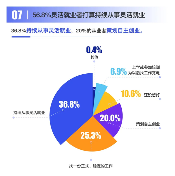 從事靈活就業,從業者不僅僅是為了增加收入,同時也非常看重鍛煉能力、發揮才能等方面。32.1%的從業者是為了鍛煉能力、拓寬路子;29.5%的從業者是通過自由職業最大化發揮才能。 此外,靈活就業有利于自由職業者通過項目整包的方式向多方輸出自己的特長、技能和資源,自由職業者擁有充分的靈活性和自主權,能夠實現自身價值的最大化。 趨勢七:56.8%靈活就業者打算持續從事靈活就業