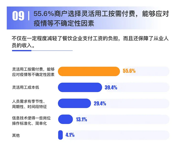 報告顯示:隨著消費復蘇,41.0%的商戶計劃在疫情后增加靈活就業崗位。互聯網平臺助推靈活就業發展,促進了靈活就業人員與崗位的技能、時間、空間、價格的信息匹配;此外,平臺推動了供、需雙方的數字化生態建設,創造了更多新就業形態和靈活就業崗位。 趨勢九:55.6%商戶選擇靈活用工按需付費,能夠應對疫情等不確定性因素