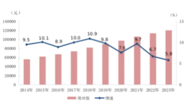2023年,全國(guó)城鎮(zhèn)非私營(yíng)單位就業(yè)人員年平均工資為120698元,比上年增加6669元,名義增長(zhǎng)5.8%,扣除價(jià)格因素實(shí)際增長(zhǎng)5.5%。