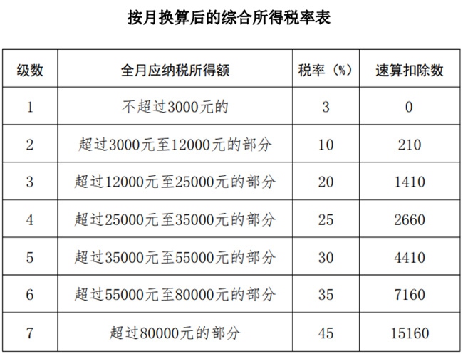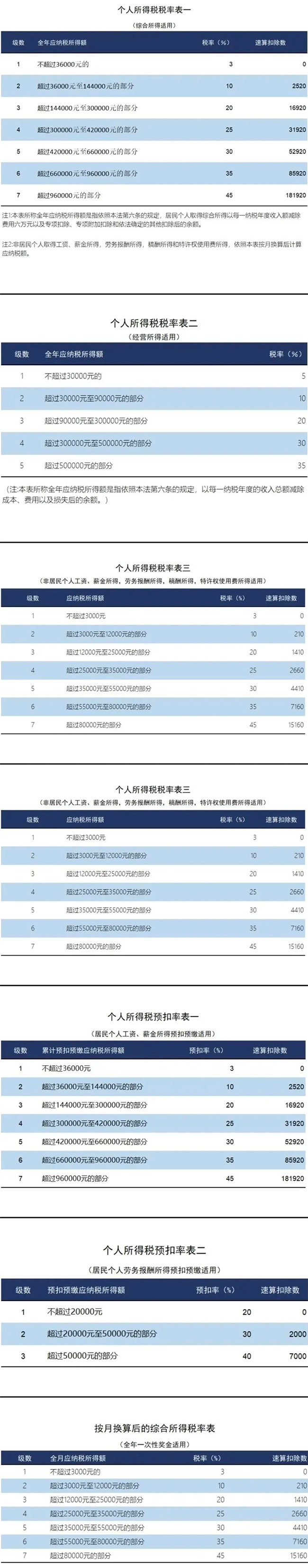 需要注意的是,一個納稅年度內,每一個納稅人只允許使用一次“全年一次性獎金單獨計稅政策"。 5、附最新最全個稅稅率表