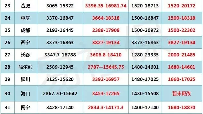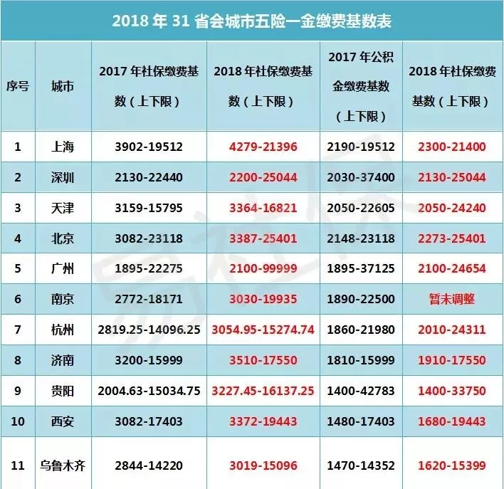 疑問二:企業與個人將補繳共計近2萬億元? 人民日報:有地方稅務人士透露,目前稅務部門與人社部門強調穩定為主,并沒有談論強化征管。實際上從明年開始,像社保繳費登記、變更信息、人數等仍由人社部門負責。 稅務部門只負責社保費的申報和征收,對社保費的稽查暫未確定。因此社會上擔心明年開始征管大幅加強并沒有道理。 疑問三:30%的利潤要沒,超七成的企業日子將難過了? 人民日報:針對社保費的政策并沒有變化,變化的只是征管方式。征管能力增強后,國家會統籌考慮,根據實際調整。專家表示,稅務部門負責征收社保費之后,征管能力確實會增強。但國家層面會考慮企業負擔實際問題,在當前情況下不太可能出現企業負擔飆升的情況。 實際上,我國社保費率已階段性降低。2015年以來,我國先后4次降低社保費率,總體社保費率從41%降到37.25%,減少企業成本約3150億元。 總結: 社保費率降低但是今后社保將有稅務統一征收,一方面節省企業用人成本;另一方面提高員工社保待遇,對誰都是有利的,所以大家不要在再質疑了。 5、2018年各大城市社保繳費基數表出爐!工資少了?待遇能漲么? 總有人問這個城市調基了沒,那個城市調基了沒,基數是多少?為此kavin特地整理了31個省會城市五險一金繳費基數,快來看看你所在城市漲了多少!