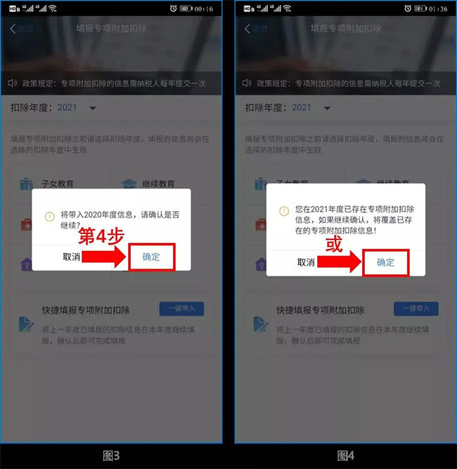② 依據提示“將帶入2020年度信息,請確認是否繼續?”或者“您在2021年度已存在專項附加扣除信息,如果繼續確認,將覆蓋已存在的專項附加扣除信息!”,確認后點擊“確定”;如下圖3、圖4: