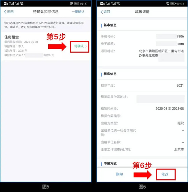 ![]() 用戶可以在確認之后在APP中點擊首頁-專項附加扣除信息查詢-選擇扣除年度“2021”-查看已提交的信息,如有變動可以選擇作廢或修改。 情形(二) ?2021年需對已填寫的信息進行修改。 如:需要修改申報方式、扣除比例、相關信息等,則需點擊“待確認”之后進入相關修改頁面進行修改。注:此方式只能修改部分信息。 如:需要修改基本信息:先進入2020年的信息頁面,修改后再重新確認。在APP中點擊首頁-專項附加扣除信息查詢-選擇年份2020年,修改之后再確認2021年的信息。 舉例:用戶需修改贍養老人的分攤比例。 點擊“待確認”狀態的贍養老人信息,點擊“修改”-“修改分攤方式”,修改成功后返回“待確認”界面,再點擊“一鍵確認”。 情形(三) ?2021年需要作廢專項附加扣除項目。 比如2021年不再申請贍養老人專項附加扣除。 點擊“待確認”狀態的贍養老人信息,點擊“刪除”,再點擊“一鍵確認”。如下圖9、圖10: 情形(四) ?2021年需要新增專項附加扣除項目。 比如2021年新增子女教育扣除,需要申報填寫。 先按情形(1)步驟確認之前申報的其他不需修改的專項附加扣除信息后,點擊APP首頁-專項附加扣除填報。如下圖11、圖12: