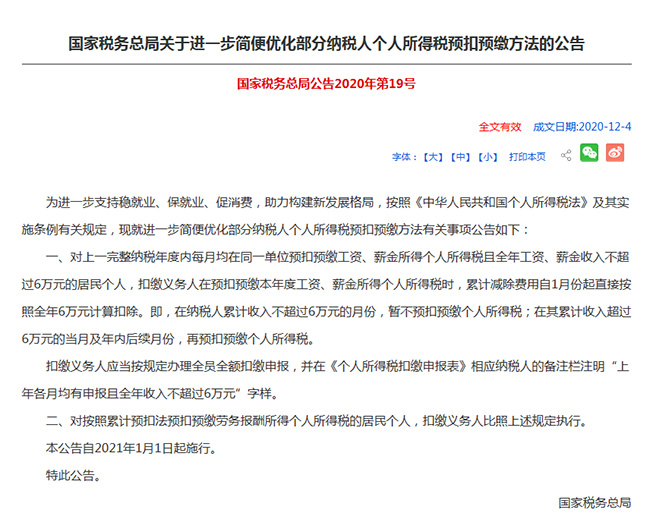 兩類納稅人,自1月起,累計扣除費用直接按照6萬元計算。 一、上一完整納稅年度各月均在同一單位扣繳申報了個稅且全年工資薪金收入不超過6萬元的居民個人。 需要同時滿足以下3個條件:1、上一個納稅年度1-12月均在同一單位任職且預扣預繳申報了工資薪金所得個人所得稅。 2、上一納稅年度1-12月累計的工資薪金收入(包括全年一次性獎金等各類工資薪金所得,且不扣減任何費用及免稅收入)不超過6萬元。 3、本納稅年度自1月起,仍在該單位任職受雇并取得工資薪金所得。 二、按照累計預扣法預扣預繳勞務報酬所得個人所得稅的居民個人(如保險營銷員和證券經紀人)。 需要同時滿足以下3個條件:1、上一納稅年度1-12月均在同一單位取得報酬且按照累計預扣法預扣預繳申報了勞務報酬所得個人所得稅。 2、上一納稅年度1-12月的累計勞務報酬(不扣減任何費用及免稅收入)不超過6萬元。 3、本納稅年度自1月起,仍在該單位取得按照累計預扣法預扣預繳稅款的勞務報酬所得。 預扣預繳方法 … 在納稅人累計收入不超過6萬元的月份,暫不預扣預繳個稅; 在其累計收入超過6萬元的當月及年內后續月份,再預扣預繳個稅。 舉個簡單例子:張三1月份取得收入1萬元,不考慮其他費用,則需要繳納個稅=(10000-5000)×3%=150元。 如果符合上述條件,由于張三月工資沒有超過可以直接累計扣除的6萬元,就不用預繳個稅。 實施時間 … 自2021年1月1日起施行。