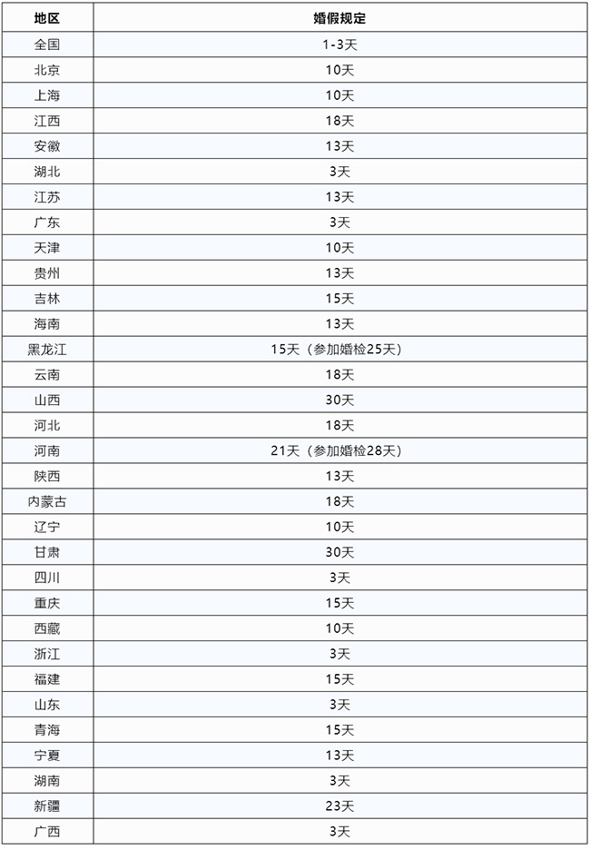 2、國家層面上關(guān)于婚假的規(guī)定 根據(jù)勞動法第四章第五十一條規(guī)定: 勞動者在法定休假日和婚喪假期間以及依法參加社會活動期間,用人單位應(yīng)當(dāng)依法支付工資。 另外,根據(jù)《計(jì)劃生育條例》的規(guī)定: 1.按法定結(jié)婚年齡(女20周歲,男22周歲)結(jié)婚的可享受3天婚假。 2.符合晚婚年齡(女23周歲,男25周歲)的將不再享受晚婚假獎勵也只有3天法定婚假。 3.結(jié)婚時(shí)男女雙方不在同一地方工作的,可視路程遠(yuǎn)近給予路程假。 4.在探親假期間結(jié)婚的不另給假期。 5.婚假包括公休假和法定假。 6.再婚者與初婚者一樣可享受法定婚假。 關(guān)于婚假工資計(jì)算方式 在婚假的問題上,雖然國家對職工的休息、休假有規(guī)定,但并未明確規(guī)定工資計(jì)發(fā)的標(biāo)準(zhǔn)。 《關(guān)于國營企業(yè)職工請婚喪假和路程假問題的通知》規(guī)定:職工本人結(jié)婚可以根據(jù)具體情況,由本單位行政領(lǐng)導(dǎo)批準(zhǔn),酌情給予一至三天的婚喪假。 假期在三個(gè)工作日以內(nèi)的,工資照發(fā)。在批準(zhǔn)的婚喪假和路程假期間職工的工資照發(fā)。途中的車船費(fèi)等,全部由職工自理。 因此在婚假的工資發(fā)放標(biāo)準(zhǔn)上,目前還沒有適用于全國的統(tǒng)一規(guī)定。 婚假是否有有效期? 1、我國法律并沒有對婚假的有效期做出明確的規(guī)定。一般來說,不同的公司會有不同的規(guī)章制度來約定婚假的有效期。 2、對于公司來說,一般規(guī)定員工一年或是半年之內(nèi)必須休完婚假,否則視為自動放棄該福利。 3、婚假必須一次性休完,不可單獨(dú)分開使用。 3、2023最新版全國婚假一覽表
