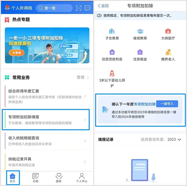 確認(rèn)前以下幾點(diǎn)需要注意 1、2023年,稅務(wù)部門公布幾起虛假填報(bào)子女教育、贍養(yǎng)老人專項(xiàng)附加扣除案例,建議咱們個(gè)人對(duì)照上圖標(biāo)準(zhǔn)誠(chéng)信填寫~ 2、住房貸款利息,經(jīng)夫妻雙方約定,可以選擇由其中一方扣除,具體扣除方式在一個(gè)納稅年度內(nèi)不能變更。確認(rèn)前確認(rèn)好由夫妻哪方扣除~ 3、夫妻雙方婚前分別購(gòu)買住房發(fā)生的首套住房貸款利息,婚后可選擇其中一套房,由購(gòu)買方按100%的標(biāo)準(zhǔn)扣除,或?qū)Ω髯再?gòu)買住房分別按50%的標(biāo)準(zhǔn)扣除,具體扣除方式在一個(gè)納稅年度內(nèi)不能變更。 4、根據(jù)以前年度操作情況,沒(méi)有點(diǎn)確認(rèn),個(gè)稅APP會(huì)將專項(xiàng)附加扣除自動(dòng)順延到下一年。提醒大家的是,個(gè)稅APP系統(tǒng)在不斷升級(jí)的過(guò)程中進(jìn)行了調(diào)整,個(gè)人信息變化或者之前申報(bào)填寫錯(cuò)誤,很可能會(huì)造成專項(xiàng)附加扣除信息失效、單位無(wú)法獲取個(gè)人的信息等問(wèn)題。即使信息沒(méi)有變化,建議大家還是核對(duì)下自己的信息是否填寫正確,最好還是手動(dòng)點(diǎn)下“一鍵帶入”。 個(gè)人所得稅APP確認(rèn)操作指南 情形一:2024年專項(xiàng)附加扣除信息無(wú)變動(dòng),只需在2023年基礎(chǔ)上確認(rèn)即可 1.在個(gè)稅APP【首頁(yè)】,選擇【專項(xiàng)附加扣除填報(bào)】,選擇【一鍵帶入】,再選擇【扣除年度2023】。2.確認(rèn)無(wú)誤后,點(diǎn)擊【確認(rèn)】。3.打開【可確認(rèn)】狀態(tài)的專項(xiàng)附加扣除信息,核對(duì)信息;如需修改,點(diǎn)擊【修改】,信息確認(rèn)后點(diǎn)擊【一鍵確認(rèn)】。如果有【已失效】信息,則需要先刪除,然后再確認(rèn)。4.點(diǎn)擊【一鍵確認(rèn)】后,信息則提交成功。無(wú)需重復(fù)確認(rèn),系統(tǒng)以最終的信息為準(zhǔn)。