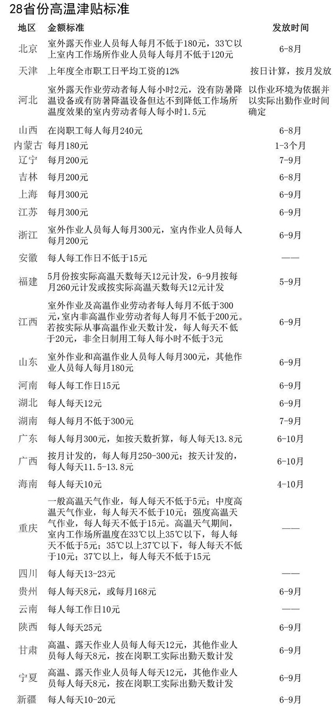 高溫津貼標(biāo)準(zhǔn)由省級人力資源社會保障行政部門會同有關(guān)部門制定,并根據(jù)社會經(jīng)濟(jì)發(fā)展?fàn)顩r適時(shí)調(diào)整。各地發(fā)放高溫津貼的時(shí)間并不一致,但不少地方是從6月或7月份開始發(fā)這筆錢。以下為28省份高溫津貼標(biāo)準(zhǔn)一覽表。