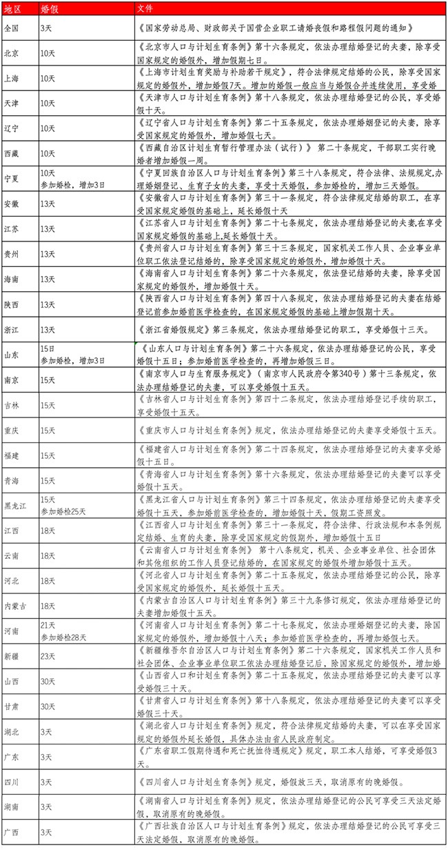 注:湖北省人民政府辦公廳發布了《關于加快完善生育支持政策體系更加務實有效建設生育友好型社會的若干措施》的通知,其中明確湖北省延長婚假至15天。 四川省人民政府辦公廳關于印發《四川省人民政府2025年立法計劃》的通知要求,擬于年內出臺婚、產假延長相關政策。 二、二婚婚假規定 再婚者與初婚者一樣,均應享受婚假待遇。 根據我國的相關規定,職工享受3天的婚假。對于再婚者的婚假問題,勞動和社會保障部門曾有明確答復,即“根據《中華人民共和國婚姻法》和國家有關職工婚假的規定精神,再婚者與初婚者的法律地位相同,用人單位對再婚職工應當參照國家有關規定,給予同初婚職工一樣的婚假待遇”。 三、婚假工資計算方法 不少企業對婚假的時間和婚假的工資支付有自己的“規定”,因此不少網友詢問婚假工資如何計算。 根據法律規定,用人單位可以制定本單位的規章制度,但是各個單位的規章制度必須符合國家或地區的法律法規和規章。 如果違反現有的法律法規和規章,這個規章制度就是違法的無效的,對職工并沒有約束作用。 如果單位硬要按“公司規定”辦事,由此侵犯了職工的合法權益,可能會有被被投訴的風險。 根據《關于國營企業職工請婚喪假和路程假問題的通知》規定,假期在三個工作日以內的,工資照發。