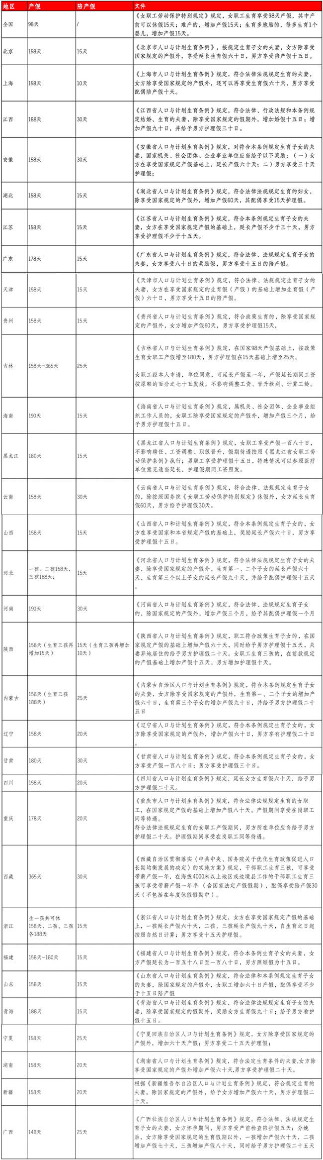 在日常實務中,大家會遇到一個最為常見的問題:員工請育兒假,可以不批嗎? 其實這個也需要分地區來看: 1、強制執行育兒假的地區 如北京、天津、上海在《人口與計劃生育條例》中都明確規定,育兒假為強制休假。就全國范圍內而言,育兒假都是強制推行的。 2、鼓勵但不強制推行育兒假的地區 但是也有少部分地區是鼓勵用人單位推行育兒假的,沒有做強制要求,如重慶市、吉林省等地。 建議查詢當地官方信息,結合當地政策來看是否批準員工請育兒假的申請。 二、育兒假工資計算標準 關于休育兒假的待遇標準,有三種: 1、地方有規定的,優先適用地方規定的標準。 舉個例子,《上海市人口與計劃生育條例》第三十一條規定:“符合法律法規規定生育的夫妻,在其子女年滿三周歲之前,雙方每年可以享受育兒假各五天。育兒假期間的工資,按照本人正常出勤應得的工資發給。”按照這一規定,上海市職工休育兒假的,用人單位應當按正常出勤標準發放工資。 2、按勞動合同或規章制度規定的標準來確定。 如果地方法規未對育兒假期間的待遇標準作出規定,用人單位可以通過勞動合同約定或者規章制度規定的方式,明確育兒假期間的工資待遇標準。但一般情況下,勞動合同約定或者規章制度規定的標準不得低于當地最低工資標準。 3、按視同出勤標準支付育兒假工資。 地方規定不明確,用人單位也未通過勞動合同或規章制度規定育兒假工資的,用人單位應當按照正常出勤支付員工工資待遇。