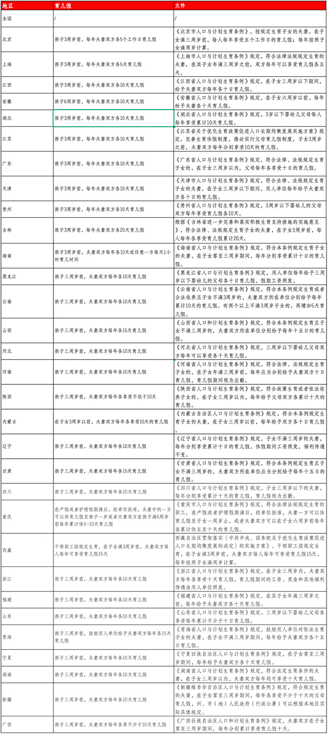 育兒假工資計算方法 一、關于育兒假的相關規定 隨著各省市《人口計劃與生育條例》的修改,大多數省份明確了育兒假。 詳情可查看下表