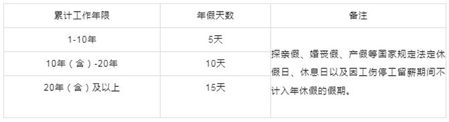 年假工資計算方法 一、關于年假的相關規定 根據《職工帶薪年休假條例》國務院令第514號,第二條,職工連續工作1年以上的,享受帶薪年休假。 其中的連續工作1年,后續出臺的條例中有一些調整,根據《企業職工帶薪年休假條例》第四條,年休假天數根據職工累計工作時間確定。職工在同一或者不同用人單位工作期間,以及依照法律、行政法規或者國務院規定視同工作期間,應當計為累計工作時間。 所以年假的條件應按照累計工作時間計算,只要累計工作時間1年及以上,就符合年休假規定。 具體年假天數的規定可查看下表: