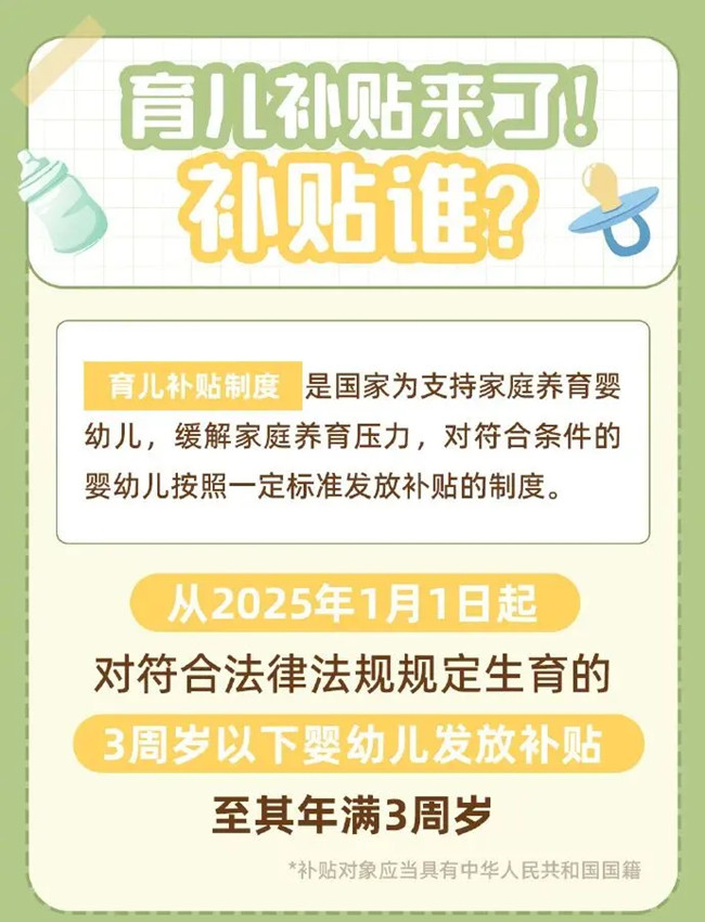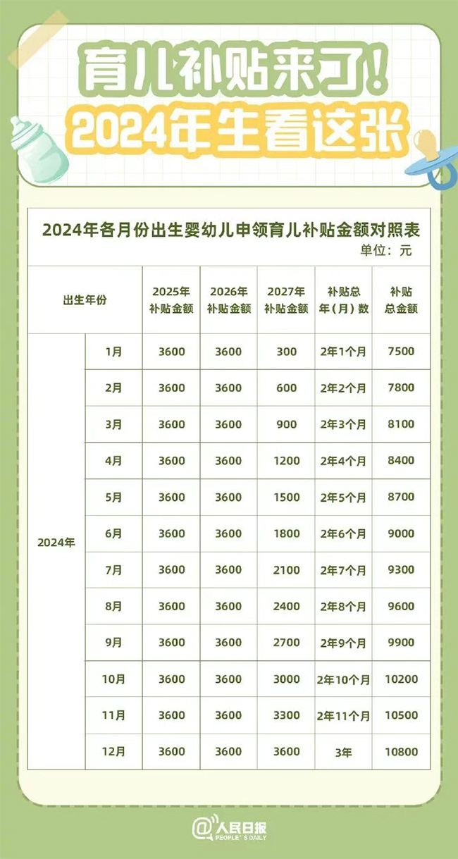 根據方案,從2025年1月1日起,對符合法律法規規定生育的3周歲以下嬰幼兒發放補貼,至其年滿3周歲。補貼對象應當具有中華人民共和國國籍。 換言之,2022年1月1日以后出生的嬰幼兒,無論一孩、二孩、三孩,均可申領育兒補貼。 育兒補貼按年發放,育兒補貼國家基礎標準為每孩每年3600元,至其年滿3周歲。 1.對于2025年1月1日及以后出生的嬰幼兒,可連續申領3年補貼,共計10800元。 2.對于2025年1月1日之前出生且未滿3周歲的嬰幼兒,可按應補貼月數折算補貼金額。 |